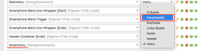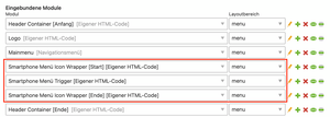 - Ändere im Bereich "Eingebundene Module" den Layoutbereich den entsprechenden Modulen von menu zu Kopfzeile